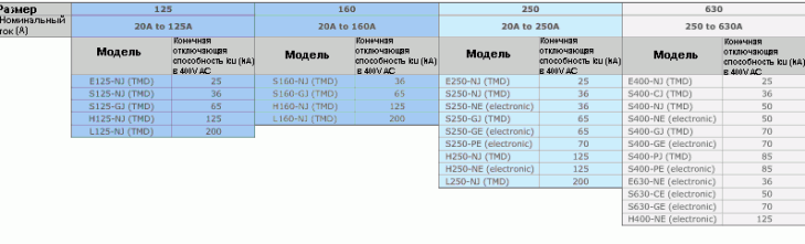 автоматические выключатели вплоть до 630 A могут поставляться